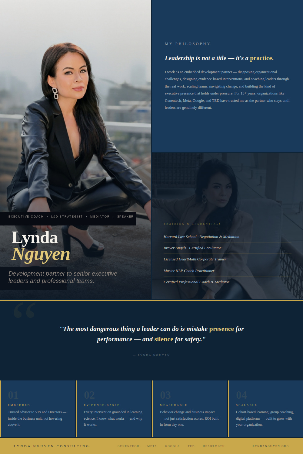 Lynda works with executives, teams, and organizations across the Bay Area, Orange County, Los Angeles, and globally, providing remote coaching and selective in-person sessions designed to drive leadership growth and organizational impact.