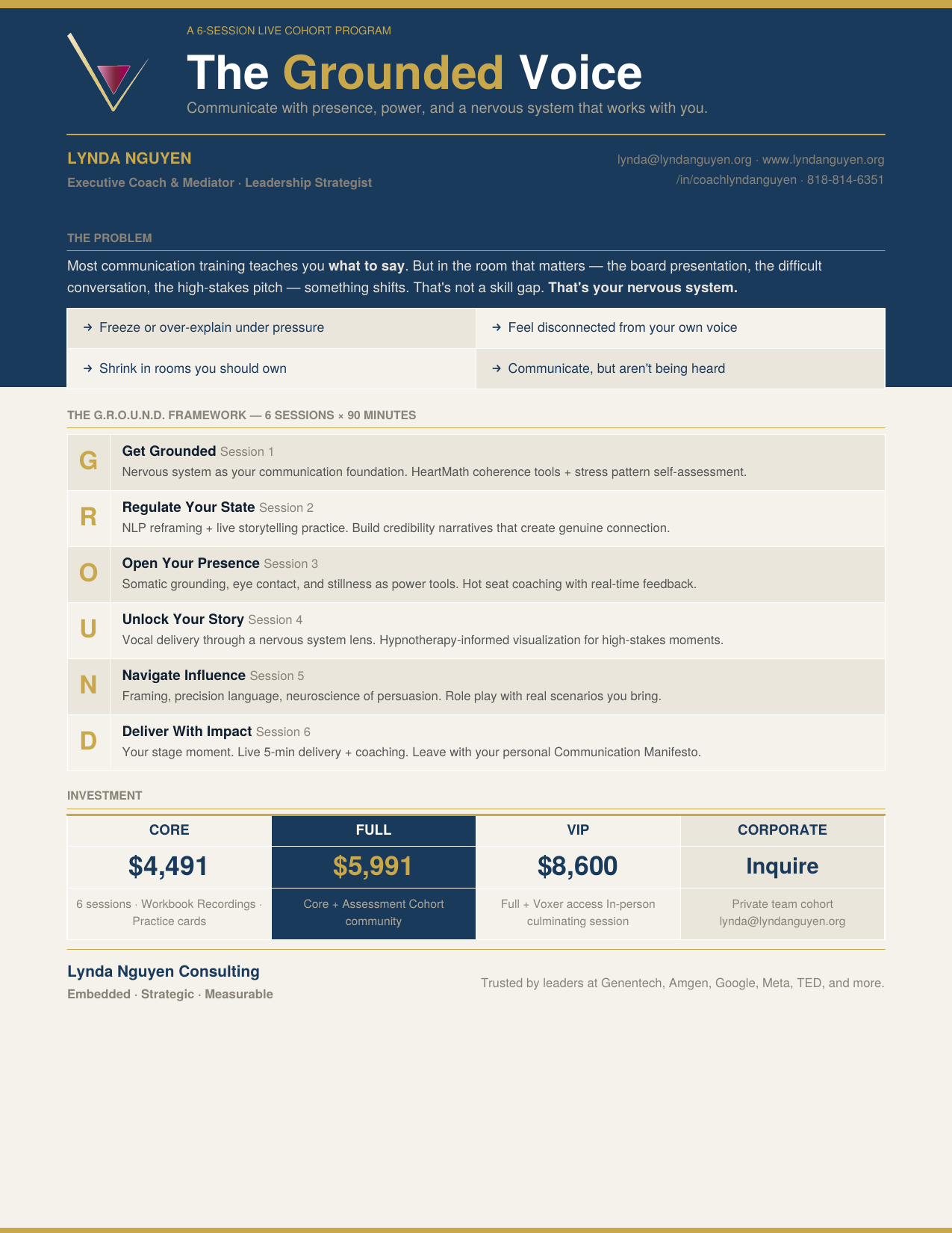 A 6-session (x90 min) & live cohort program for leaders who are ready to communicate from the inside out. Ready to join?